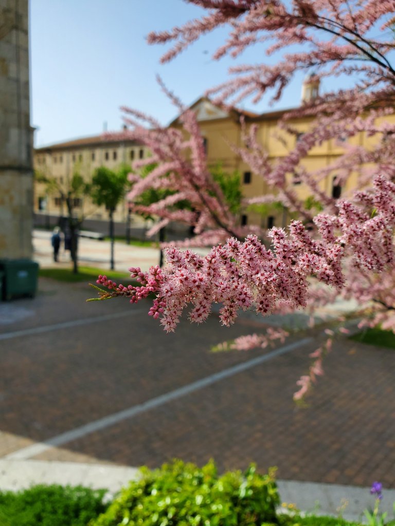 We took the slow train from Madrid to Salamanca, which was nice because the countryside was lovely and the regular speed allowed us to catch more than just a quick glimpse of the stone walls and villages, as well as some cows and blooming fields. The train had two stops in Salamanca and the second was closer to our hotel. What we didn’t know was that the stop was just that. The train stopped, there was a platform, but no signs, no buildings; so it was a good thing some guy on the train told the people in front of us that we were at the last stop and should exit. We followed them. I don’t remember what exactly our plan was for getting to the hotel, a short two kilometers away, but it is good we pack so we can make those walks.