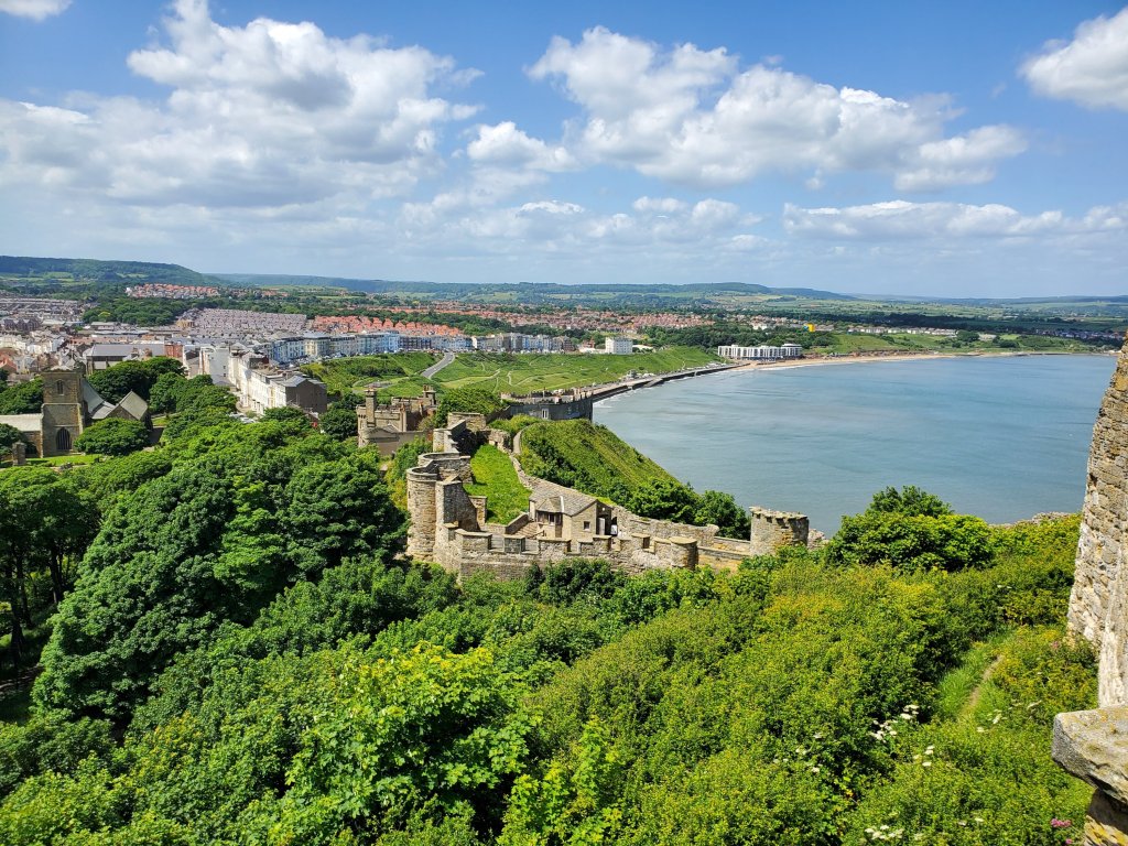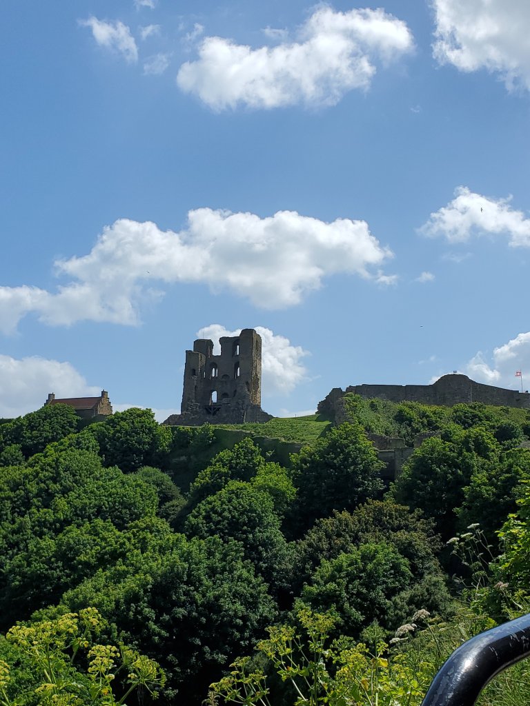 As we communicated with Ian leading up to our getting together in York, he offered suggestions for our time in Yorkshire. One recommendation was a day trip to the coast to see the city of Scarborough. So, we hopped on the train, enjoyed a scenic ride through some bucolic British countryside, bought the local tourist map for 1 euro from an interesting map vending machine, and headed – up hill, as usual – to the local castle. The views on the walk up were amazing as the castle was situated at headlands and the coastline in this part of the world is pretty good looking.