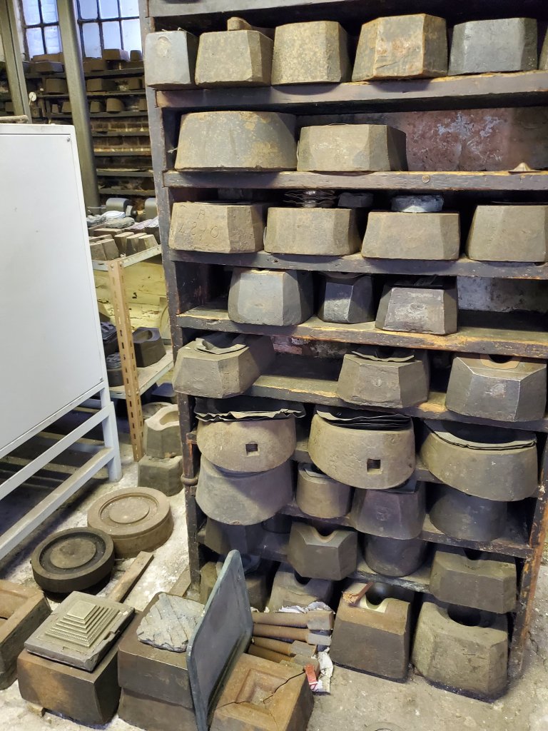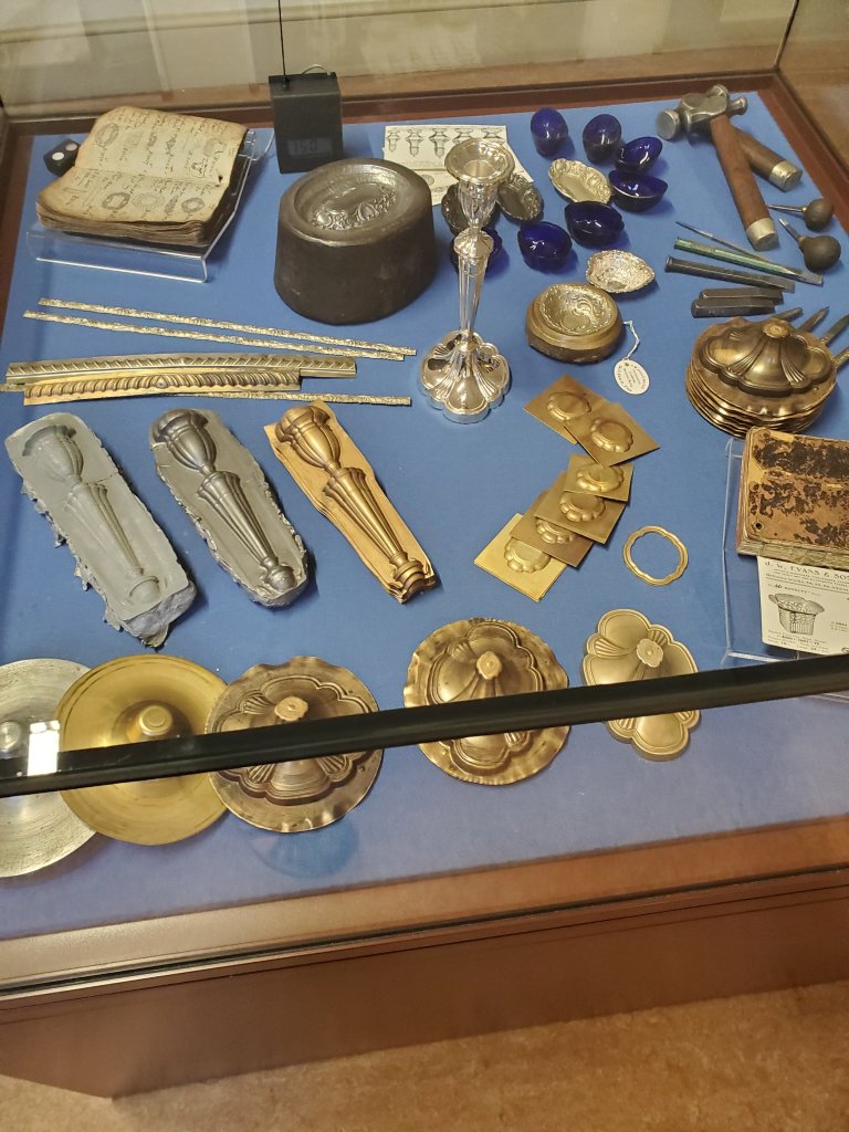 This is what “lock management activities” look like, and our help. We saw several of these stations around town – they are folding electric bikes you can rent. Pretty cool!The English Heritage Site that tempted us to go to Birmingham was a jewelry factory. It was a place where they carved forms and stamped items that were then silver plated and sold by various jewelers. This place was held by the same family for generations and was in operation from the late 1700s to the early 2000s. It was then sold to English Heritage, but the last remaining family member and company president will still show up and do tours. We didn’t have him for the guide, but it was very interesting. This picture is the display that showed the stages of making their signature candle stick. The family kept everything, so they have pretty much every form they ever used. In fact, some group was in town to celebrate their 100th anniversary and approached the company to see if they could recreate some piece that had been done for the organization in it’s early days. Well, a little digging in the files, and some rooting around in the shelves, and yes! they could recreate the100 year old design using the original forms! The tour guide had to warn everyone that this was a very old factory, so there were lots of hazards – trip hazards, random nails, and the like – and that it was a bit dirty, because “even our dust and dirt is historic!”The side of a canal boat, from the canal boat tour.Another canal boat and one of many pedestrian bridges over the canals. There is also a bridge that was renamed to celebrate a famous Birmingham Group – Black Sabbath.One of many of the original bridges used to for traffic over the canals. This is at a canal intersection, so there is a tow path below, and that bridge was part of the tow path for the canal we are on.