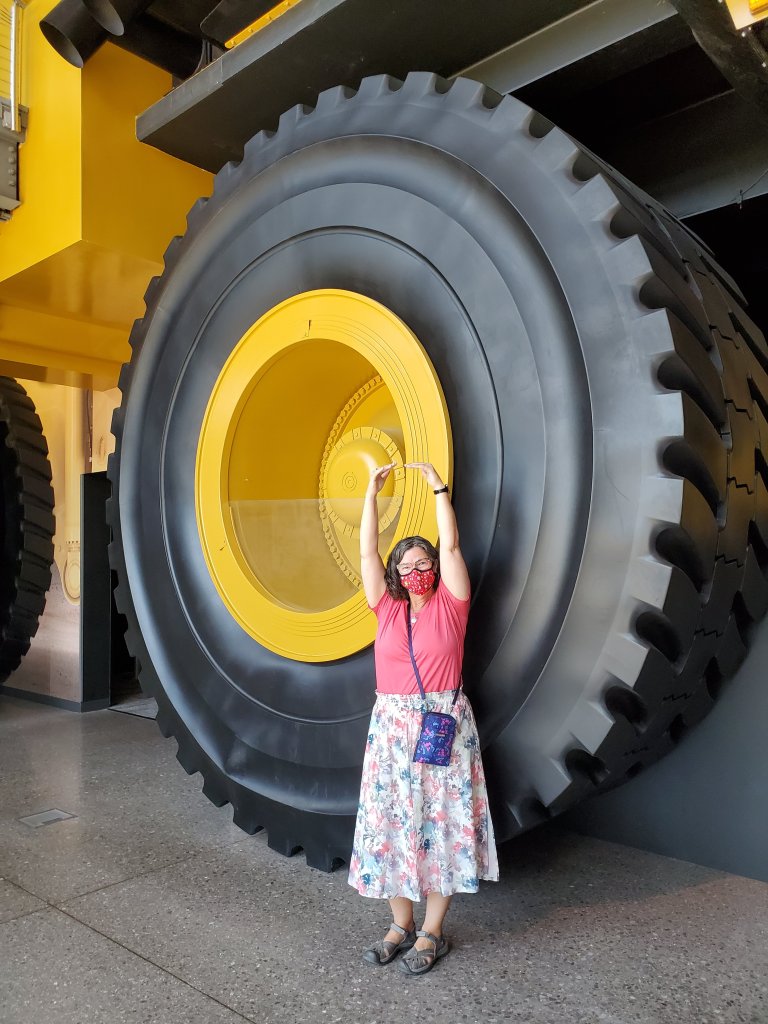 Caterpillar is headquartered in Peoria, and they have a Visitors Center. It is a Cat Museum! Lots of information about the history of the company, how the huge machines are made and used, and hands on ways to see what the innards of machines look like. So, you can see a lot of the equipment with way less mud and dust than you might expect. Plus, they have simulators! You might think the simulators would fairly straight forward, but Lisa can tell you it is easier to wreck the bulldozer (and, remarkably, even the backhoe) than you would think.