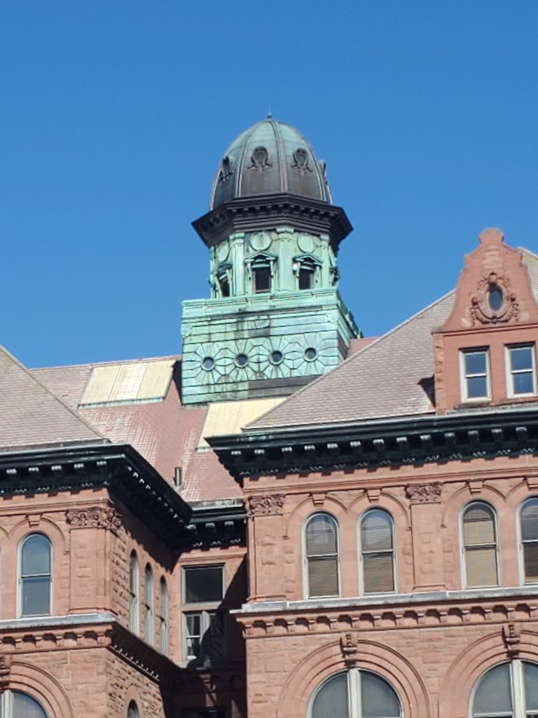 This truck, used for mining, is 2 stories high with the truck bed down and a whopping 5 stories high when fully extended. They put a theater for the introductory movie in the truck bed. The seats rumble as you watch the movie so you can experience the power of the engine.The tires of that beast are 14 feet high!Why is it called Caterpillar? Because a photographer brought out to document one of the first pieces of equipment made a comment. So, pretty much how many nicknames are assigned.For our loyal readers, the random building with copper that has achieved that beautiful green patina.It is the City Hall, so maybe less of a random building.