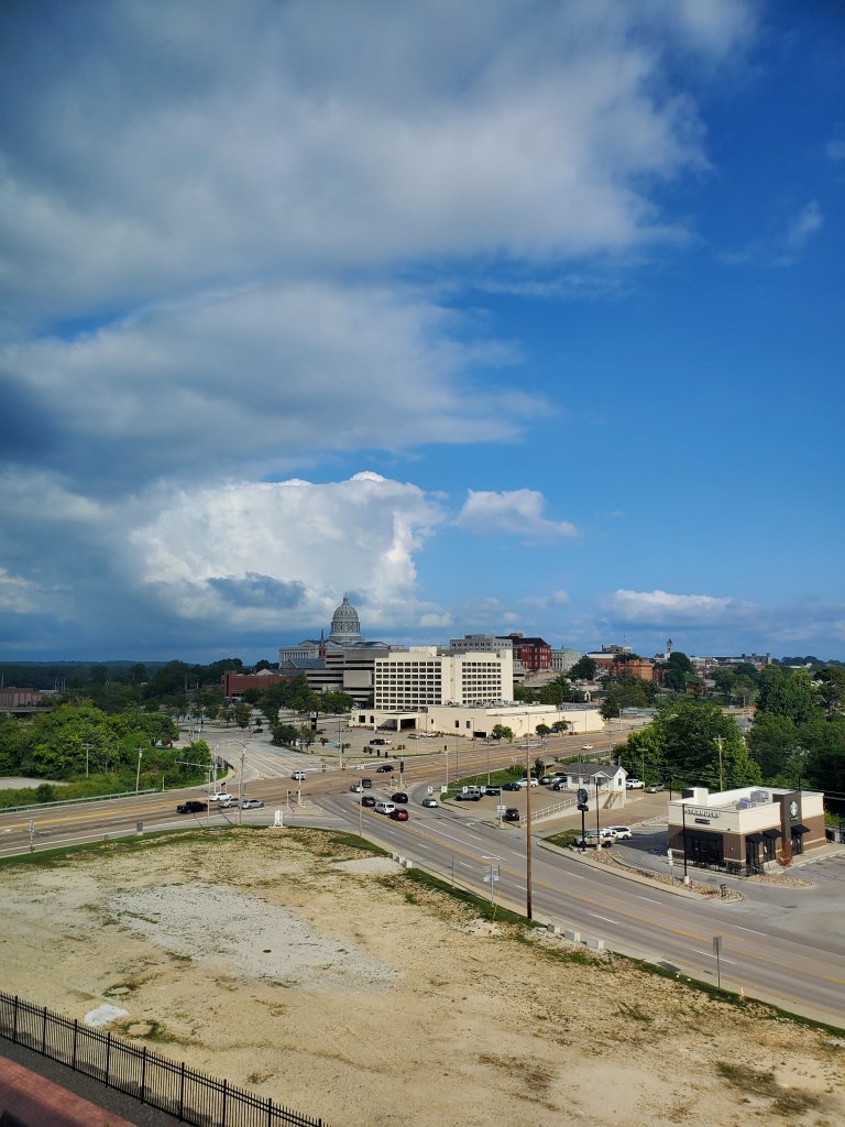 Visiting State Capitol Buildings is a side travel hobby that has been going on for over 20 years, there are only a few left, so there won’t be too many featured on this blog. But, our fall road trip took us through one of the remaining to be seen Capital cities, Jefferson City, Missouri. Our hotel was perfectly situated on a hill opposite of the rise where the Capitol was built. The building was situated above the banks of the Missouri River and is visible from a long way away – intentionally. We lucked out with a beautiful evening view and a nice day for the walk to take our tour.
