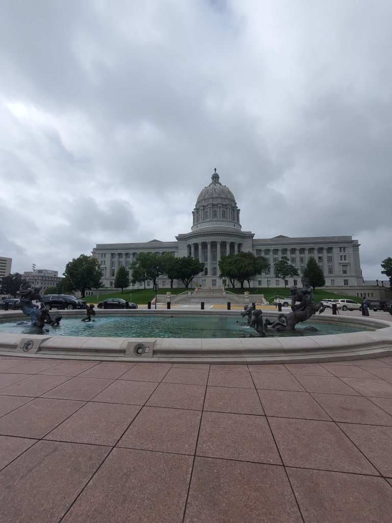 Our view, the hotel had a great outdoor space, with firepit, so we spent the evening out there. Three women who were locals joined us after a successful evening gambling at the local Veterans club and were very enthusiastic about what we would see and learn about on our tour.The Capitol from the Missouri River side, they had several nice plazas.Barges being moved down the river as seen from the plaza near the Capitol Building.A Rotunda Picture. The Missouri Capitol has a lovely, layered Rotunda. It is the third capitol, replacing two previous buildings both destroyed by fire. When the second one burned, the state budgeted $3 million for a new building and sold bonds. They raised almost $4 million, but stayed on budget and completed the building with about a million dollars left over.After the Attorney General ruled the extra money could not be returned, and had to be used on the Capitol Building, they allocated those funds to art and decor, and boy does it show. There are many decorative flourishes, including stained glass windows, murals, and statuary.This little guy lives at the base of the banister on the stairs in the rotunda near the visitor center.The House Chamber was getting new carpet, so they had temporary desks set up for the upcoming special session. They were also upgrading the voting system, so there was a lot going on. The stained glass here was made by a company set up by two men who had recently left the Tiffany Company to set up their own shop. The folks in charge of spending the money on this building were always on the lookout for a bargain.More of the stained glass and the pillars, which are made to look like marble using an Italian method known as Scagliola. This method was used on the columns in the Ohio Statehouse’s Judicial Annex Building as it was a favorite design method in the early 1900s. Yes, one of us is a little bit geeky about this stuff.Did we say the patio at our hotel had a great view?