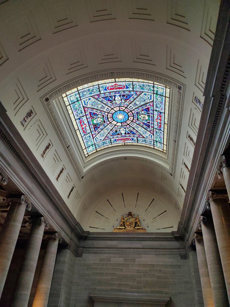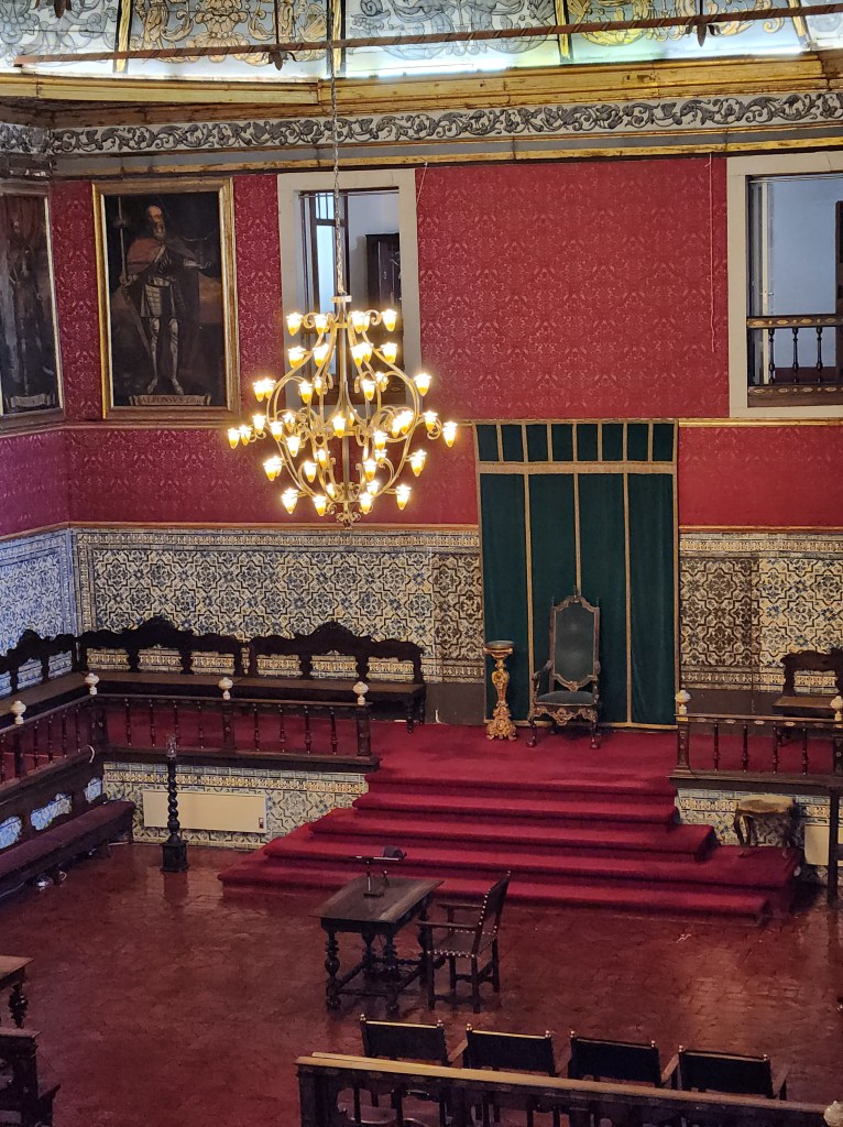 The area was lit by a skylight three stories above. The sky lights here are often round or oval with some decorative metal work visible from the outside and I was very excited to be able to see how one looks from the inside finally! This one, especially, did not disappoint.Looking down from the third floor. The stairs only go to the “public receiving rooms” on the first floor, there are other stairs to get to the upper floors.The skylights can be clear glass, but it is not unusual for there to be stained glass. These had some nice color. Also, the detail on the ceiling show just how wealthy and important this family portrayed itself to be. Not casting aspersions or anything, but we weren’t able to find out too many details about them, so we have to base our impressions on what the house was like. It is my blog, so I can put up as many photos of the skylights as I want. I have been intrigued by these on every visit to Portugal and often commented that it would be nice to see what they are like from the inside, so this hotel gets extra credit points for giving me the opportunity to see such a nice one!