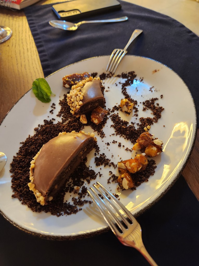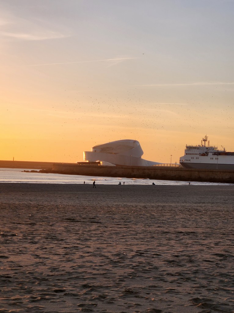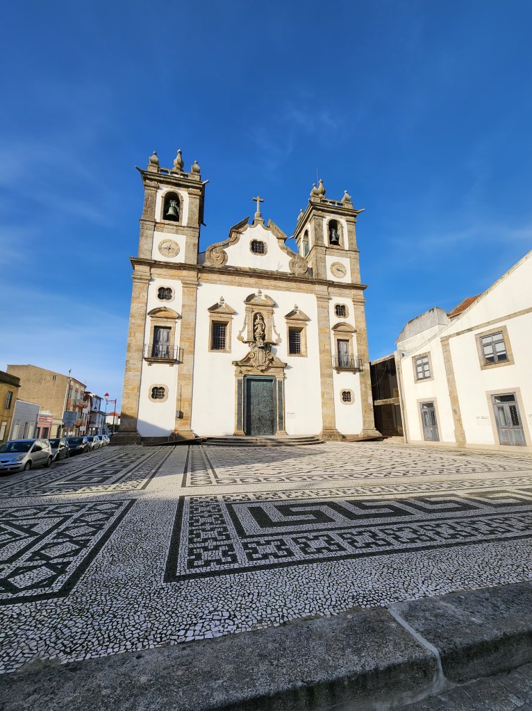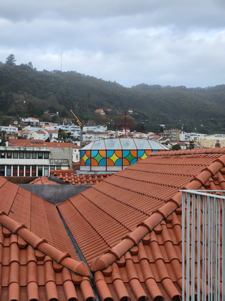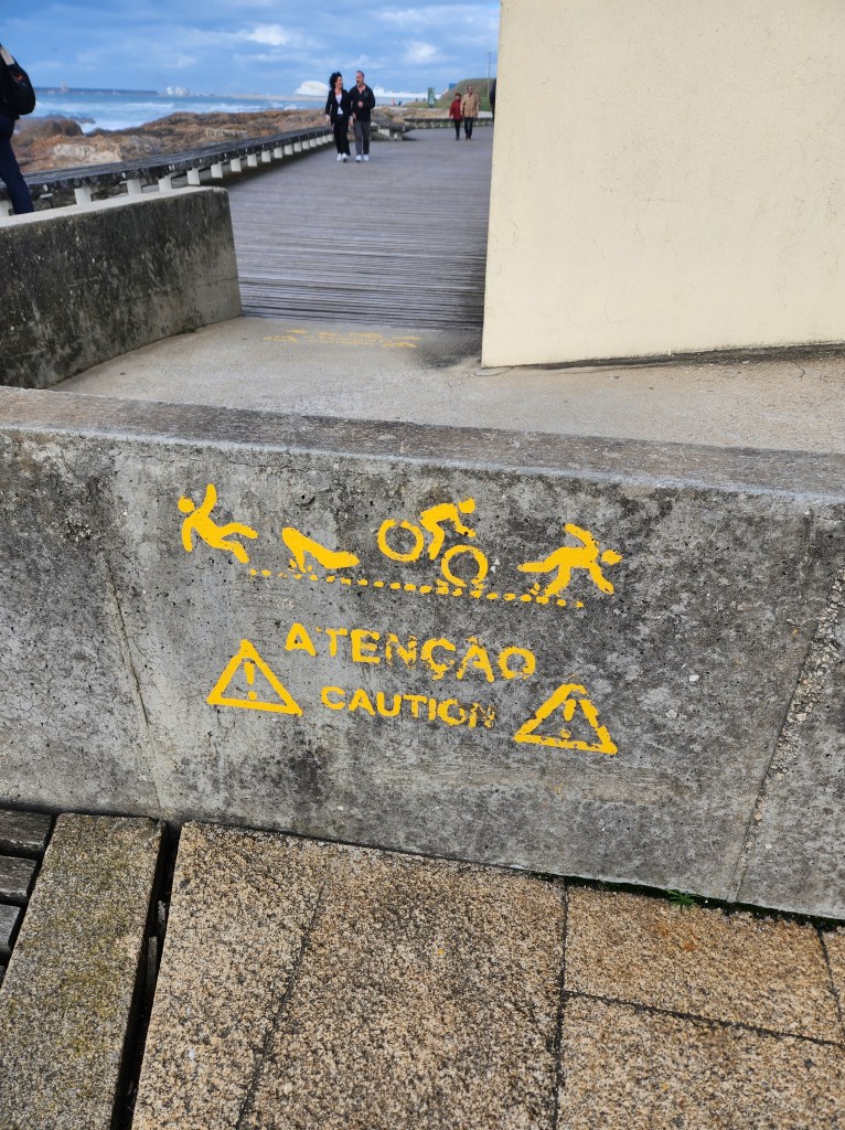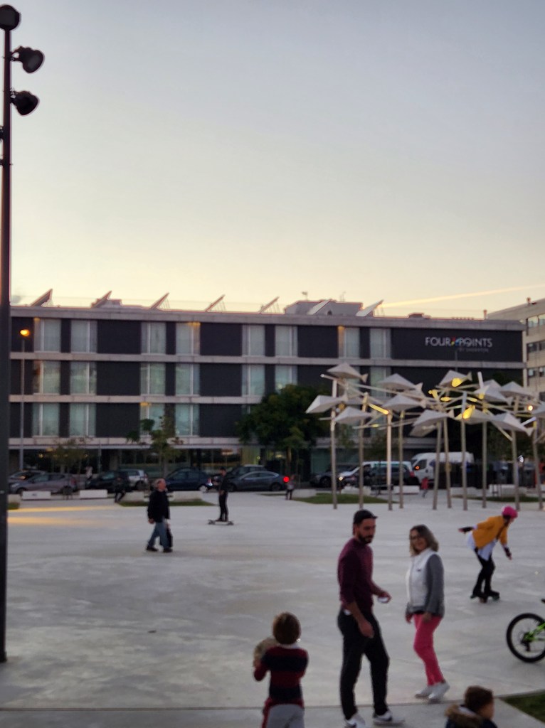 Our hotel overlooks a park with fountains, and lots of space for wheeled activities. The weather was great for early November, so the people and dog watching has been fun!The Chocolate Hazelnut dessert. We were talked into this on our first visit, exactly 6 months to the day before we were again tempted. On the first visit, it was observed that we must really like each other, because this is seldom shared.And, the remains of another dessert – this time the chocolate brownie. It’s actually not on the dinner menu, but was brought over (10 feet or so) from the cafe because the Dessert Whisperer knew we had tried all of the other desserts.The hotel is in Matosinhos, just north of Porto on the Atlantic Coast. There are a lot of beaches, and a very nice walking path. This view is from a small park that offers shady places to sit and enjoy the waves.There are many buildings with skylights like this, not all of them are colored glass, nor do they line up with the setting sun for a photo so nicely.This is the cruise port lit up at sunset. And the beach, which is just down the street from our hotel. One of the things we really like about this location is being able to take a short walk down to the ocean. There are always things going on, from surfing lessons and futbol matches, to beach volleyball and a paddle ball game that looks like fun.One of the items on our list to do during this visit was ride the transit to the far flung stops and see what was there. Povoa De Varzim is at the north end of the red line, so we bought some tickets and headed out. It was a nice ride out at mid-morning. We arrived in town, and this is the city building. The fort for the city. This is a coastal fishing village and the fort provided protection from Pirates! The gates to the fort. Beginning in the 1400s, these fortifications protected the city. It took its current form in the 1740s and was restored by the city in 2015.Povoa de Varzim is on the Way of St. James, a pilgrimage that goes through northern Portugal. This church sits on one of the routes. Lapa Church, built by the local fishermen and near where the fishing boats dock. On the back is a small lighthouse. The Main Church, this church is away from the coast and a bit out of the city center, but the sun was shining on it and it looked nice.Back in Matosinhos, another scene from the walkway along the ocean. They aren’t kidding, between the spaces in the boardwalks, the gneiss boulders protruding on the walkway, and the risk of wandering to the edge of the path while watching the waves, a tumble is certainly possible! But, so far, we have managed to fall in love with the area and not make an actual fall.