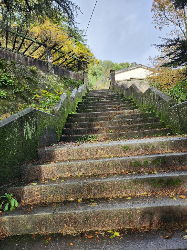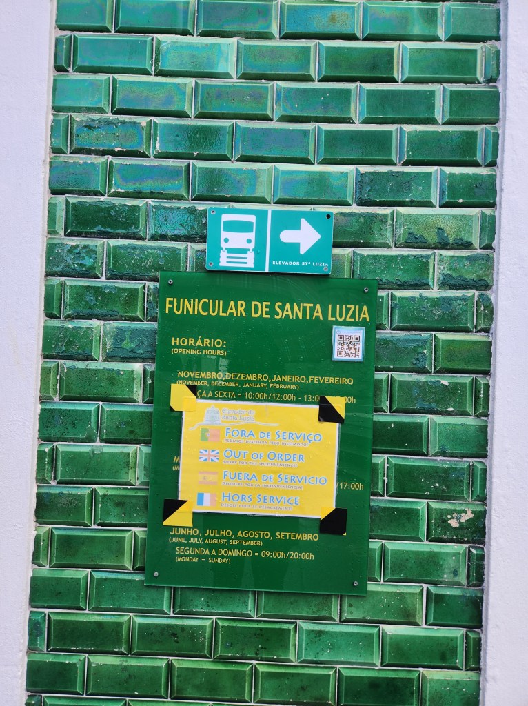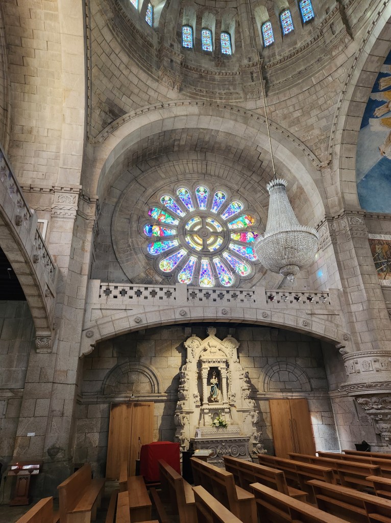 The sun, and a rainbow, over the Praça da Republica. The city was decorating for the Natal (Christmas) Holidays but there were still plenty of flowers blooming.Another square and a statue honoring someone from the city’s past. Look, I know you follow this blog for the photos and not for the detailed information!Some of the lovely buildings facing the park and the river. The tiles are used in many places in Portugal, and especially along the coast as they provide good protection from the elements.The park along the river.One of the “must see” places in Viana is the Sanctuary of Santa Luzia, which presides over the city atop the hill. There are choices on how to get there, one choice is the steps. According to the Fitbit fitness tracker, it was about 46 flights of steps to get to the top of the hill.Another options that is usually available is the Funicular, which also advertises great views on the way up and down. Alas, it was being serviced while we were in town, so we can save this option for a future visit.The day was a bit cloudy with intermittent rain, but as we got to the top, the sun came out and highlighted the beauty of the church.The Sanctuary of the church had some beautiful windows and stonework. Like many churches in Portugal, the interiors have lots of flourish and statuary.The stairs to the top of the hill are not the end of the climb. You can also climb to the top of the church! It starts out with regular steps and then you get to some VERY NARROW and windy circular stairs. Dan had his backpack with him, and he took it off and carried it because stairs were so narrow.Once you complete the climb, you are rewarded with some amazing views! This is looking west from the top of the church over part of the city and the Atlantic coast.An interesting statue on the grounds. The church sits in a large park that includes the ruins of a Roman fortification. The ruins were not open when we wandered by, so we have another item for a future visit.