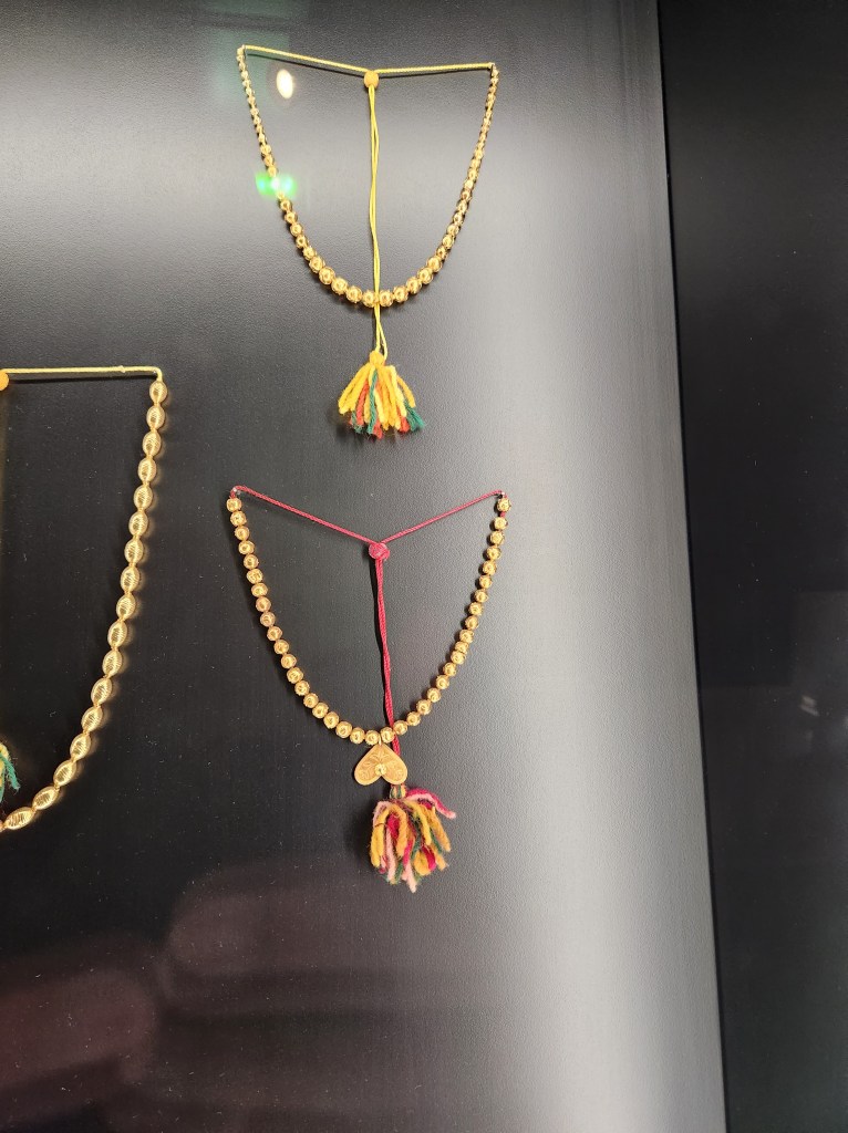 Preparing yarn for the weaving of cloth.Working costumes for various types of labor. The straw garment is very similar to those used in the Douro valley to keep farm laborers warm and dry during the region’s rainy winters.The Festival Costumes for women are usually red and include ornately embellished aprons and pockets worn over patterned skirts, and then the bright scarves and bodices are added. The stockings are knit, often with a pattern and paired with a clog. Young women would weave the fabric with designs ranging from geometric patterns to elaborate florals. The pockets, which are tied around the waist and just peek out from behind the aprons, are worked with colorful thread and shiny beadwork.The region is also known for distinctive gold jewelry. Even today, the jewelry stores display pieces with the distinctive patterns and filigrees. Necklaces and lacy dangling earrings are as much a part of the costume as the apron and fancy pockets.The jewelry ranges from the large and fancy to the more delicate.