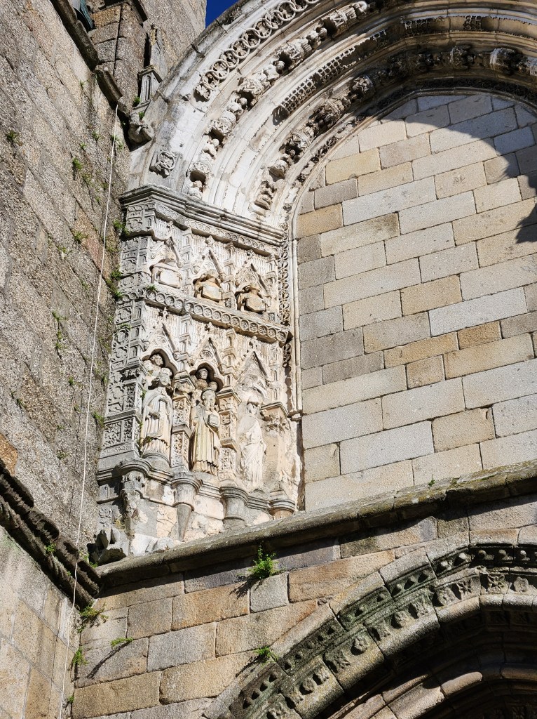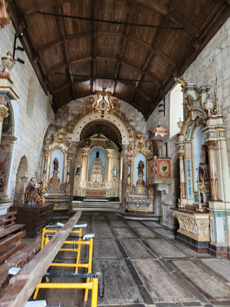 A bridge across the River Minho that has great views and a nice set up for pedestrians. This area is part of a Caminho de Santiago Portugal, so there are lots of folks making the walk that starts in Lisbon and takes you up in to Spain. We have been in many cities that have portions of the trail.The border marker in the middle of the bridge – and the river.Valenca is home to the most expansive fort built in Portugal, and it is impressive. The walls still “protect” a vibrant community inside. We approached from the north, or river, side of the fortress and were, frankly, unprepared for how big this place is!Looking out over just one small area of the fortifications.One of several churches inside the walls. This one is being restored and you can see how elaborate the embellishments are since there are fewer distractions. The artwork seems a bit graphic about the fate expected for some!Another view of the fortifications, looking back in toward the fort and the community inside the walls.