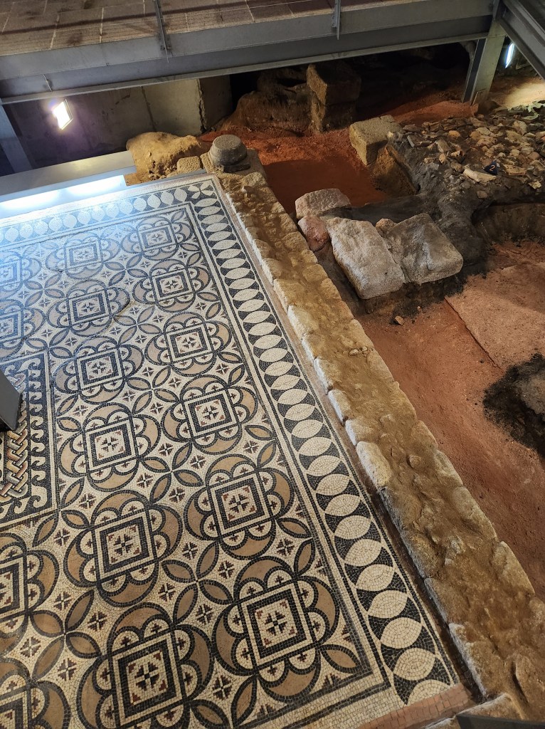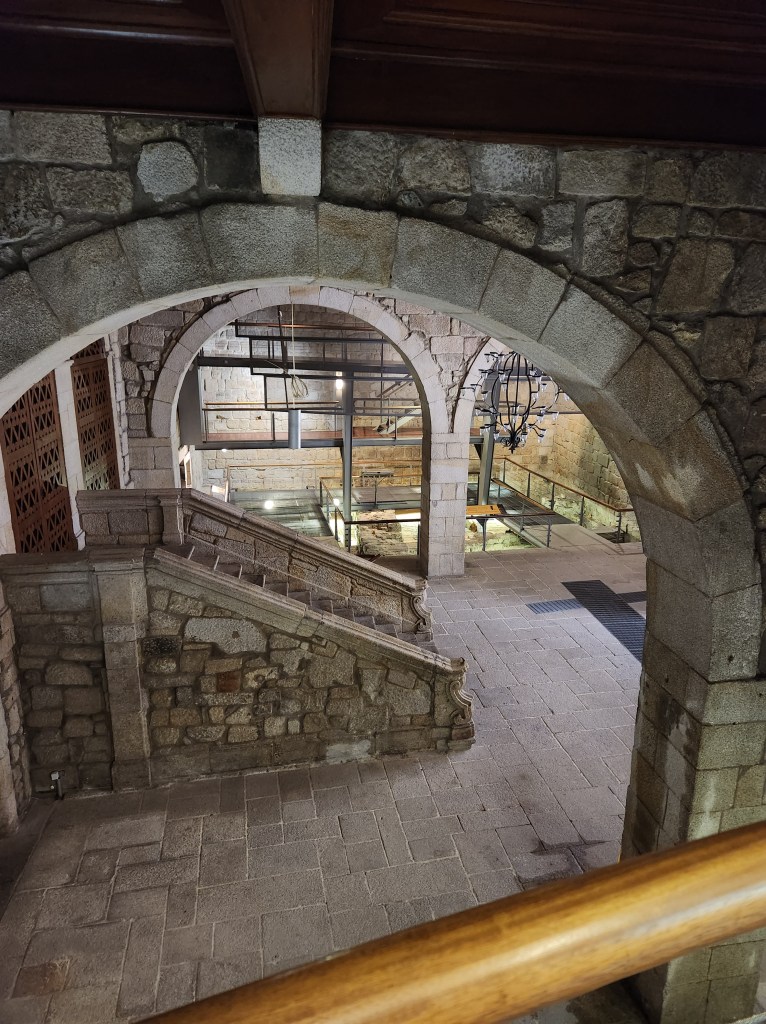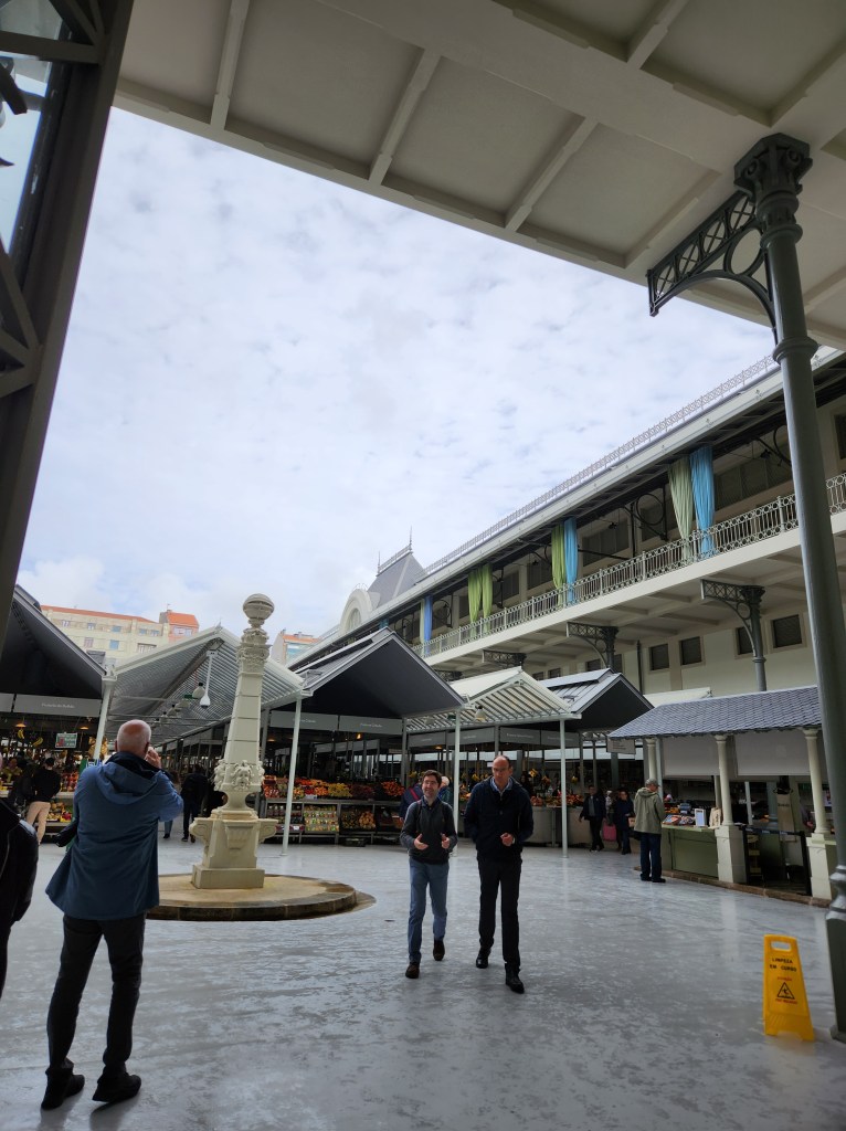 One day we caught the bus to the Balhao Market in Porto. When we were here in May the Market was under renovations and the temporary space was a nicely laid out area in the lower level of a small shopping center nearby. The historic market is a lovely building with very clean lines and a nice open courtyard for the vendors. There were fruits, vegetables, nuts, baked goods, butchers, fishmongers, cheese mongers, candy, coffee, and much more. They are still working on some of the space which looks like it will hold restaurants, so lots of reasons to go back. It is so new and nicely renovated that it was almost too “clean,” but the many folks who will visit and drip and drop will make it feel more like it should soon.One of the days we walked around Porto we ended up on a street high above the banks of the Douro – if you know anything of Porto, this describes quite a few of them. We came across this sculpture paying homage to the “Carquejeiras” or Gorse women of Porto. These women transported 40 to 50 kilos (88 to 110 pounds) of gorse (a plant with several uses and is edible) from the banks of the river up the steep bank into the city center. They were not celebrated, but they contributed to the local economy. We visited the Casa do Infante part of the City Museum. The building, built on top of an even older Roman building, began life as the customs house for the bustling port, and was the birthplace of Henry the Navigator while his parents, the Kind and Queen were in residence in the 16th Century. There were several exhibits, but for us the star of the show was the building. There were plenty of placards describing the building features and a very good display walking through the various activities and tools used for counting, weighing and taxing the goods coming through the port. In addition, they minted coins here. This photo is looking toward the main entry hall. During excavation of the building, which had been sold in the 1800s to a prominent family, but had come back under the possession of the government and was being restored, they found remains of a mosaic floor in the original Roman building with which is shared part of the foundation. They restored and recreated the details of the floor.A statue in the square near the museum. Yet another location the gulls view as being put there for their use.