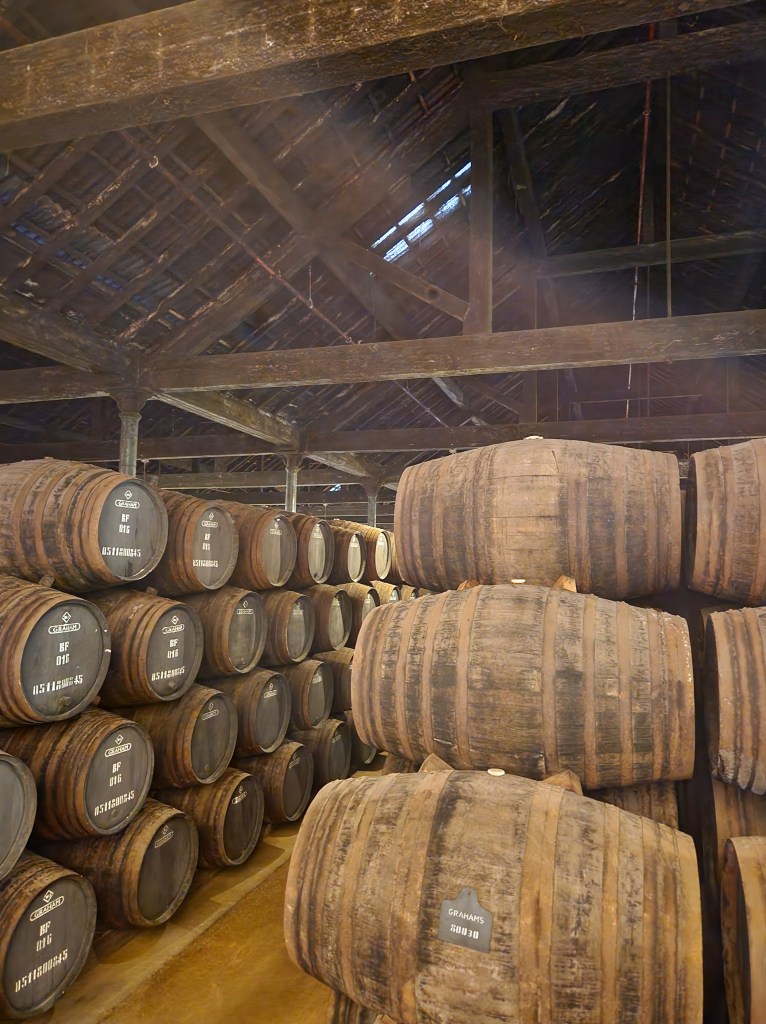 The tawny port ages in the smaller barrels shown here, which hold about 600 litres each. These barrels previously aged wine and this also adds to the port process. The smaller barrels mean the port spends more time in contact with the wood which impacts both the flavors and the colors.