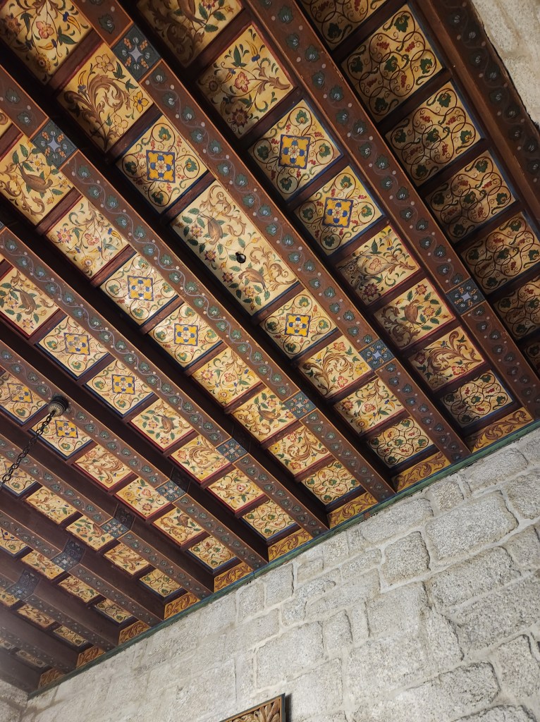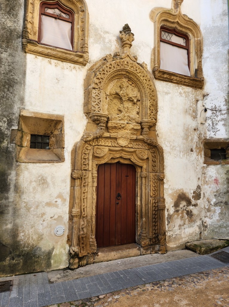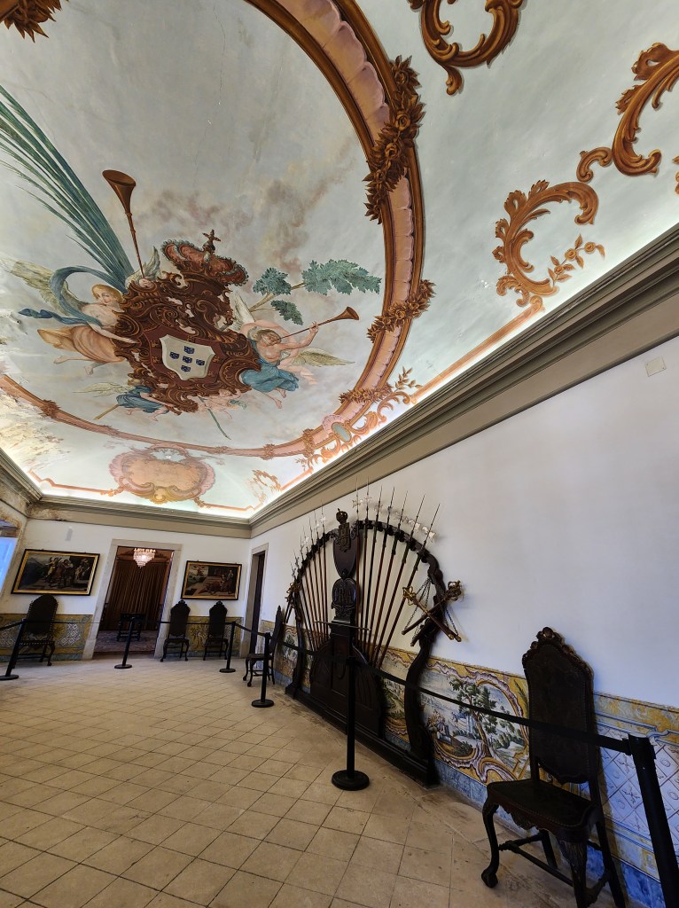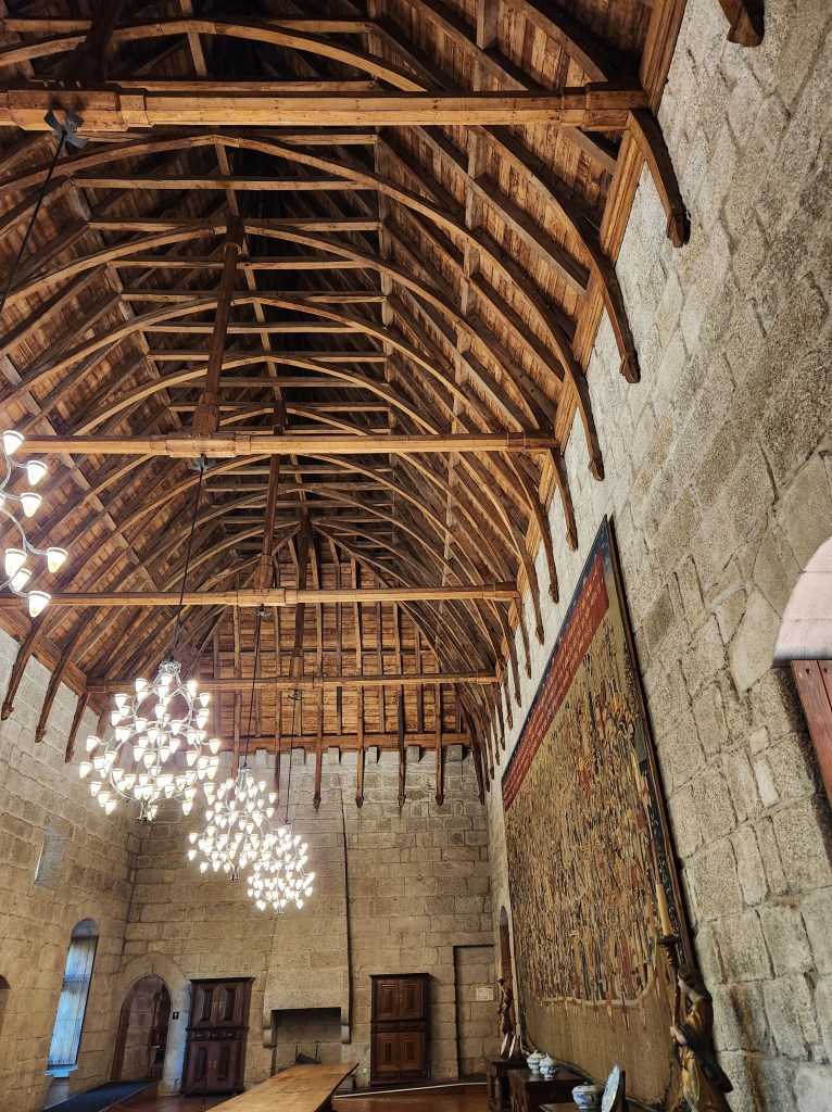We had a lovely day and arrived to both Holiday decorations and some lovely fall foliage.The Duke’s Residence is the restored Castle built for the Duke of Braganza in the early 1400s. Restored in the early 20th Century (possibly a little fancier than the original), it is now a museum filled with Art and decor from the first few centuries of Portuguese history. It has a display of armor and weapons, as all good castles should!Swords, and spears, and blunderbusses, Oh My!The size of the rooms was impressive, along with the support systems for the ceilings. What amazed both of us was that there were way fewer fireplaces than we would have thought they needed. Many of the larger rooms had one fireplace, and many of the smaller rooms had none. We did see some braziers, where hot coals would be gathered and placed near seating areas, so I guess they relied on the many layers of clothing to keep warm.The chapel, with some lovely stained glass and nice wood carvings.A view of the chapel entrance from across the courtyard. The bright marble columns were brought back from the Holy Land as pillage from one of the crusades.In one of the Duke’s private rooms, a very fancy ceiling. The ceiling details in many of the buildings in Portugal is amazing, so don’t forget to look up when you check out these places! Another fancy ceiling in the Duke’s private quarters.A view of the Castle walls. The castle is not restored, except for one tower, so it looks about like you’d expect an eight or nine hundred year old structure to look. Very impressive.The one tower that is restored houses a nicely done interpretation center, geared toward school groups. It includes the chance to wear a helmet like Alfonso’s and wield a sword! Alas, both were attached to the wall so I couldn’t lop off Dan’s photo finger for taking this shot!In town there are many old buildings to check out, and they have some lovely details in the stone carvings.More detail in the carvings. I found this building entryway to be photogenic, and it is quite possible a similar photo appeared in our Guimaraes post earlier this year.