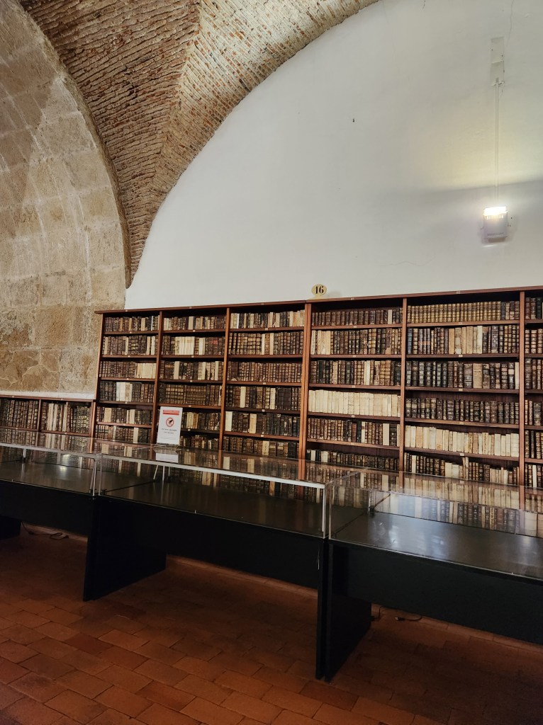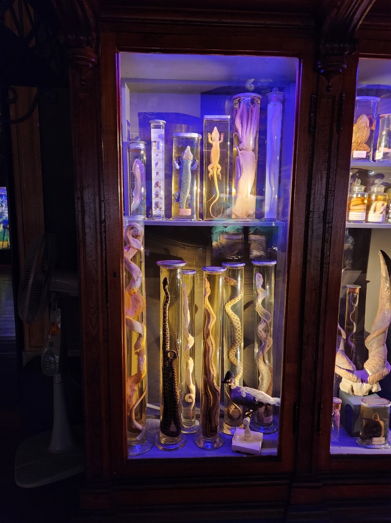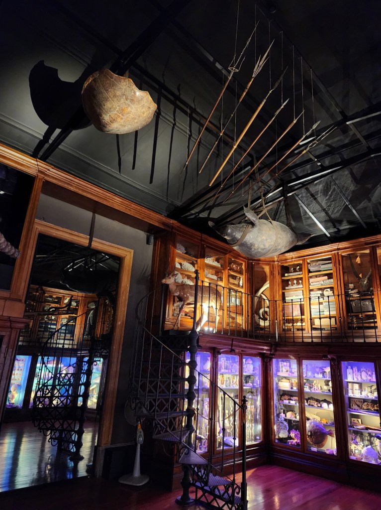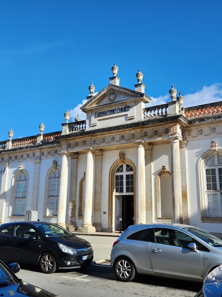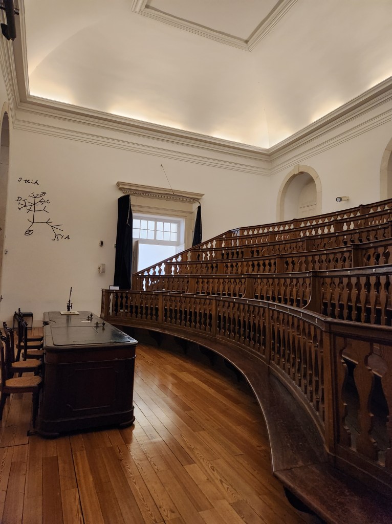 Our hotel brags about the view from their rooftop bar, and the benefit of a December visit means you get the nighttime scene! Those of you who know we keep toddler hours likely aren’t surprised we missed this view when we were here when the days were much longer.The Cabinet of Curiosities is in a science building and you start out in one of the classrooms watching a film that tells you – in Portuguese – about the creation of the display. While we really couldn’t understand the film, it looked like some people at the University realized they had several hundred years of stuff that had been collected and stored, and maybe they should put some of it on display. Anyway, the classroom was obviously old and the chairs were pretty fancy.On the way to the Cabinet of Curiosities they walk you through a gallery filled with minerals and other geological samples. They had a number from the United States and elsewhere around the world. I thought this one was lovely.Inside the Cabinet of Curiosities. A good sized room lined with two stories of glass fronted cabinets and larger samples hanging from the ceiling. There are no labels; each section might have a theme, but it wasn’t always obvious. We have since learned that these cabinets were a thing in the 18th and early 19th Century to show off the variety of things being discovered. The “theme” of this section was things that scare people! As you can see, there is really nothing to give you any context about what you are looking at. Also, the lighting is very dramatic! The University spent a few years preparing this Cabinet and it opened in 2022. Here’s an article that gives a nice summary https://www.uc.pt/en/article?key=a-aecdff5827The movie showed how the enormous crocodile was restored and then wheeled through the halls to be hung from the ceiling, so we felt like we really got something out of the movie experience despite not really understanding the information they were sharing. As you can see below the large reptile, the collection spans many academic disciplines and cultures.Across the street from the Cabinet of Curiosities is the Chemistry Lab Building. As with so many places in Portugal, the building is as much of the experience as the exhibits. The University dates back to the Middle Ages and has been in Coimbra since the mid 1500s.A lecture hall in the Science Building, my short legs would have had plenty of room, but Dan would have some banged up knees if he had to find a seat for a lecture here.In the Pharmacy Lab. Here they made medicines to distribute during a terrible cholera outbreak. The main Library door. The tour starts in the lower levels, walks you through the old “prison” area and then up to book storage before you reach the main library area. There are no photos allowed in the main library, but it very impressive both architecturally and by the volume of old books in the collection. Efforts to digitize the contents of the library are ongoing, and books can still be checked out. I am not sure what status you need to have to check out a 300 year old book, but apparently it can be done! The other fun fact is that there is a colony of bats that live in the library and are used for pest control! They drape the fancy tables with leather blankets at night to protect them from bat droppings and the bats protect the books from insects.In the area of the library below the main section is what was the “public area” which was available for people to come in and read books. You can see a lot of the architecture here, including the stone mason’s marks on some of the stone work.Creating the supporting arches for these buildings is quite the engineering feat, and is also an artistic accomplishment when done by the master bricklayers who built these buildings. Yes, I spend a lot of time looking up in these old buildings.The books.
